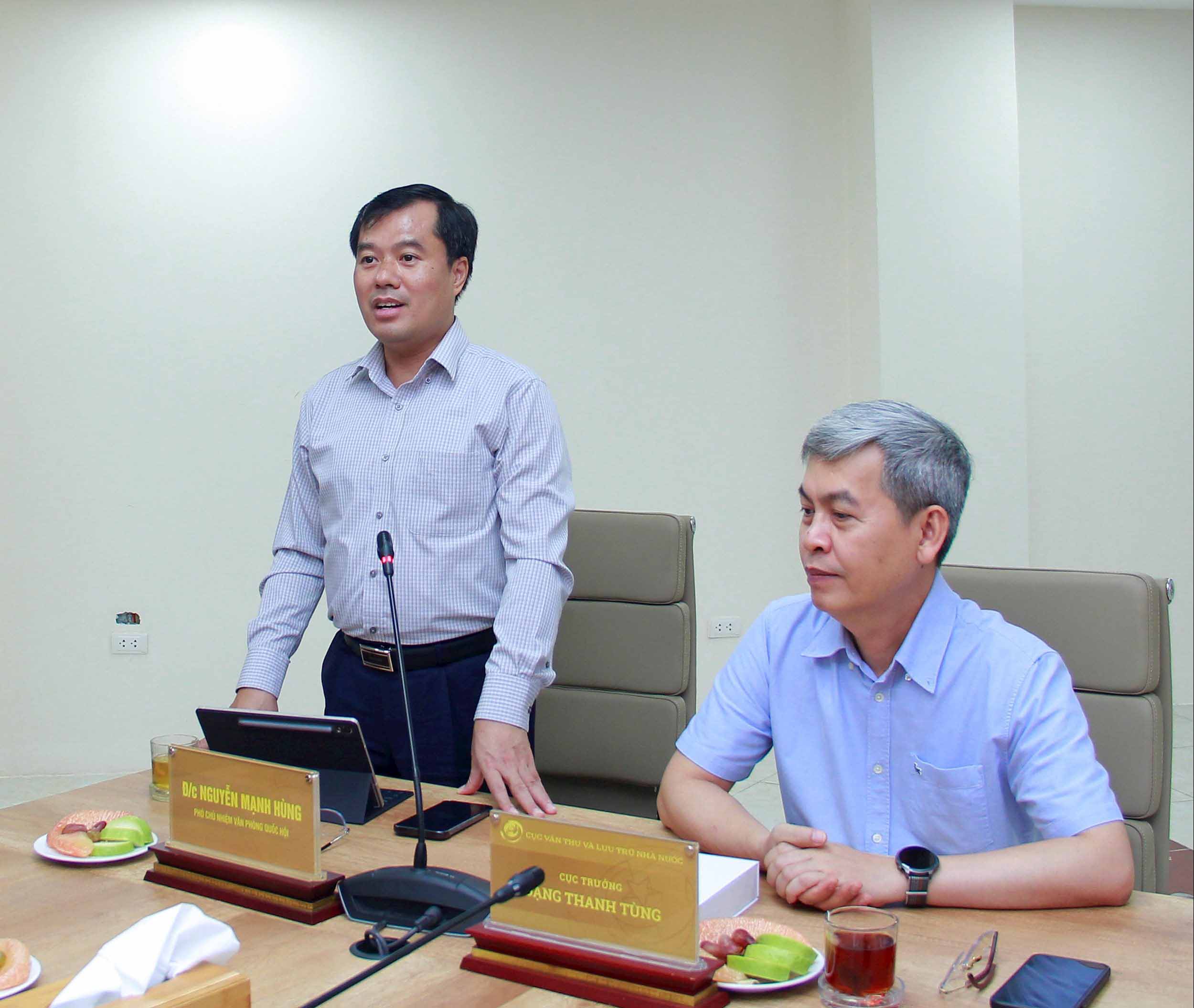 Phát biểu tại buổi làm việc, Cục trưởng Cục Văn thư và Lưu trữ nhà nước Đặng Thanh Tùng cho biết: bắt kịp xu hướng thế giới về lưu trữ số, năm 2020, Cục Văn thư và Lưu trữ nhà nước bắt đầu triển khai thực hiện dự án Lưu trữ tài liệu điện tử Phông Lưu trữ Nhà nước Việt Nam với các hạng mục chính gồm: thiết lập hạ tầng công nghệ thông tin Kho lưu trữ số, xây dựng Phần mềm Quản lý tài liệu lưu trữ số dùng chung của các Trung tâm Lưu trữ quốc gia, chuyển đổi dữ liệu tài liệu lưu trữ số hóa từ hệ thống cũ sang hệ thống mới, số hóa tài liệu lưu trữ có tần suất sử dụng cao. Đến nay, Phần mềm Quản lý tài liệu lưu trữ số đã được hoàn thiện và vận hành, cơ bản đáp ứng quy định của pháp luật về quản lý tài liệu lưu trữ số và quản lý cơ sở dữ liệu tài liệu lưu trữ.