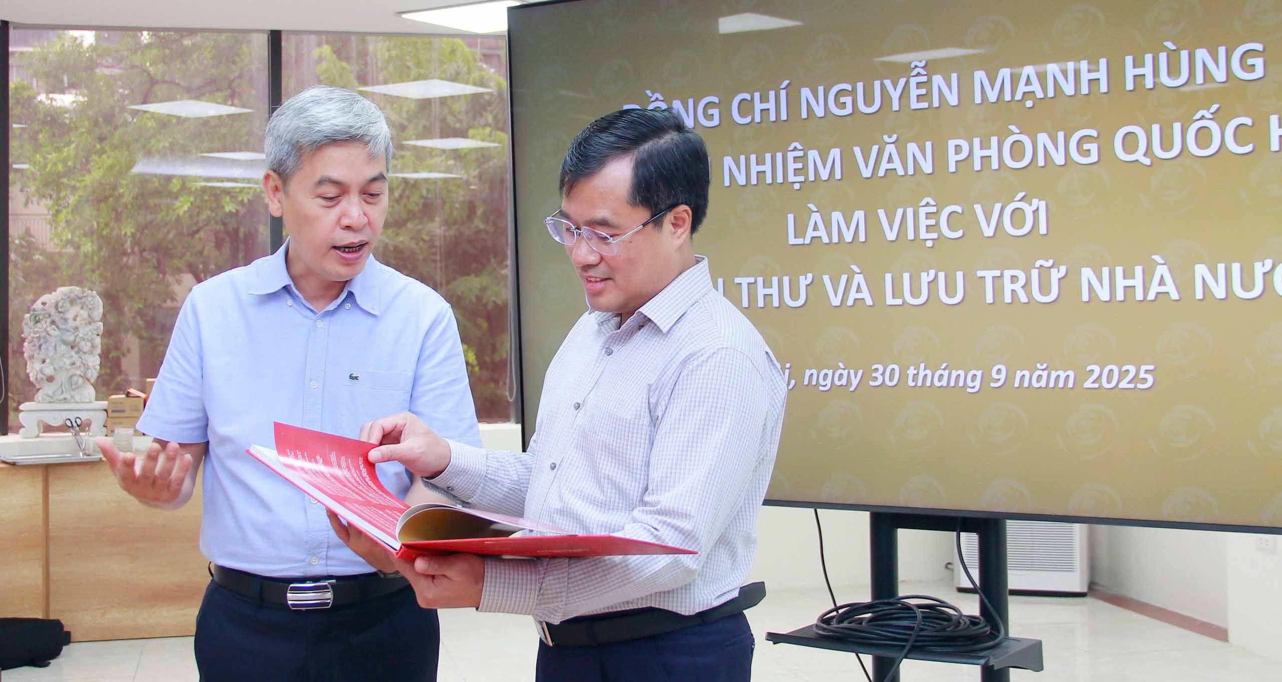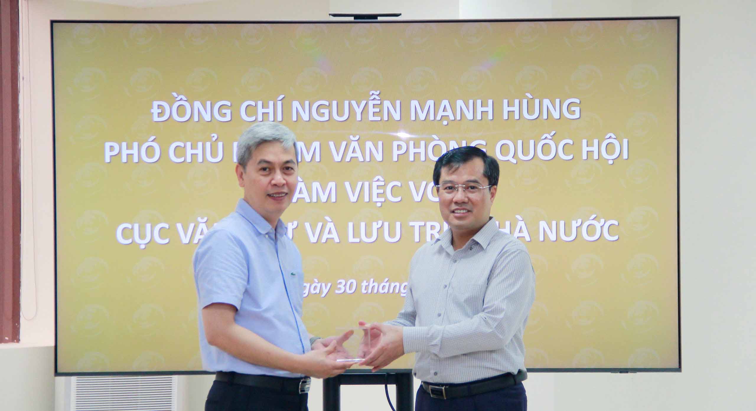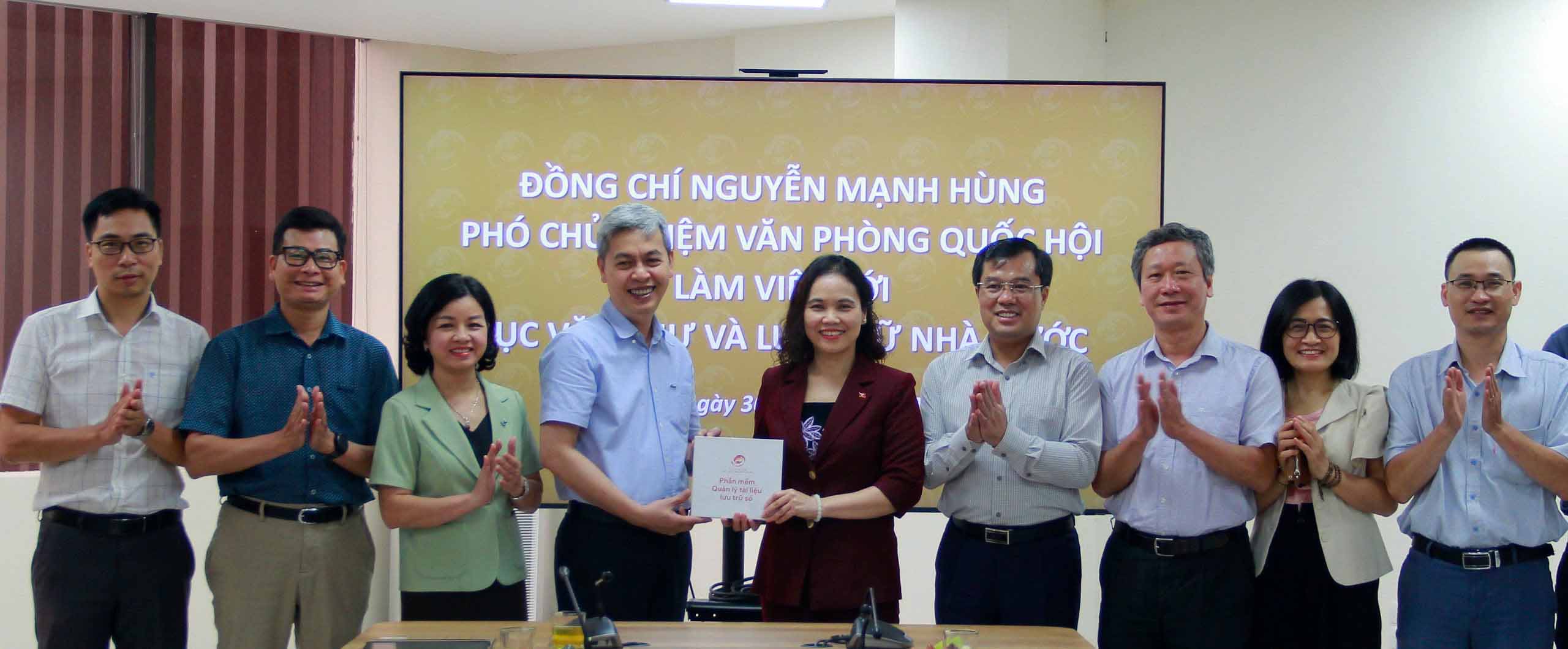 Tại buổi làm việc, Cục văn thư và Lưu trữ nhà nước đã chuyển giao Phần mềm Quản lý tài liệu lưu trữ số cho Văn phòng Quốc hội để Văn phòng Quốc hội nghiên cứu, hiệu chỉnh đáp ứng yêu cầu thực hiện nghiệp vụ lưu trữ số tại cơ quan Quốc hội.