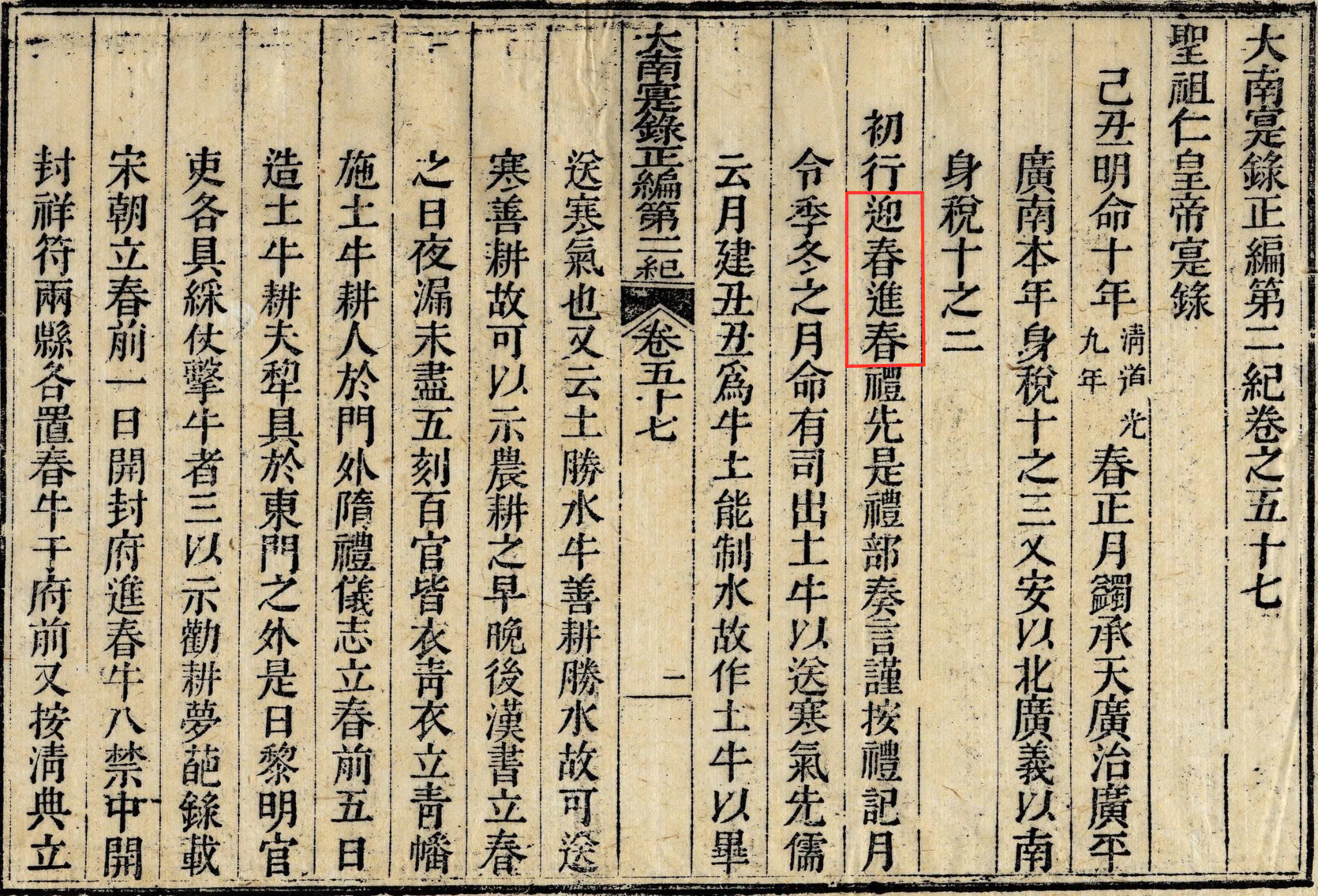Bản dập Mộc bản sách Đại Nam thực lục chính biên đệ nhất kỷ, quyển 57, mặt khắc 1 ghi chép về Lễ Nghinh Xuân, Tiến xuân. Nguồn: TTLTQGIV