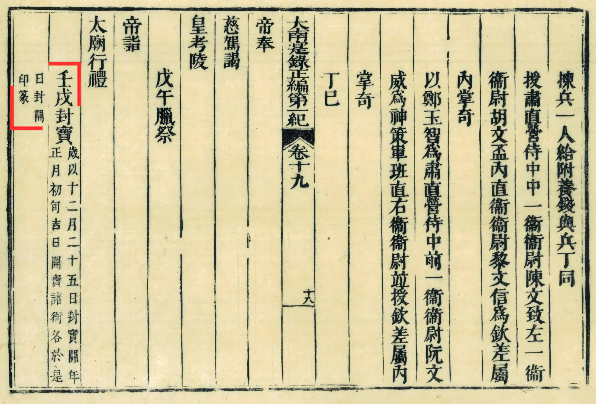 Mộc bản sách Đại Nam thực lục chính biên đệ nhất kỷ, quyển 64 đã chép: “Chuẩn định, từ nay trở đi phàm quan binh thăng bổ ra làm quan ngoài mà nhận được chỉ vào sau ngày phong ấn, nếu nói thăng bổ có việc quan hệ khẩn cấp thì cho do bộ tâu xin, cho đi nhận chức ngay, còn thì đều cho lưu lại đến tiết Nguyên đán theo ban vào chầu mừng chờ đến sau ngày khai ấn mới đi. Ghi làm lệ mãi mãi.”