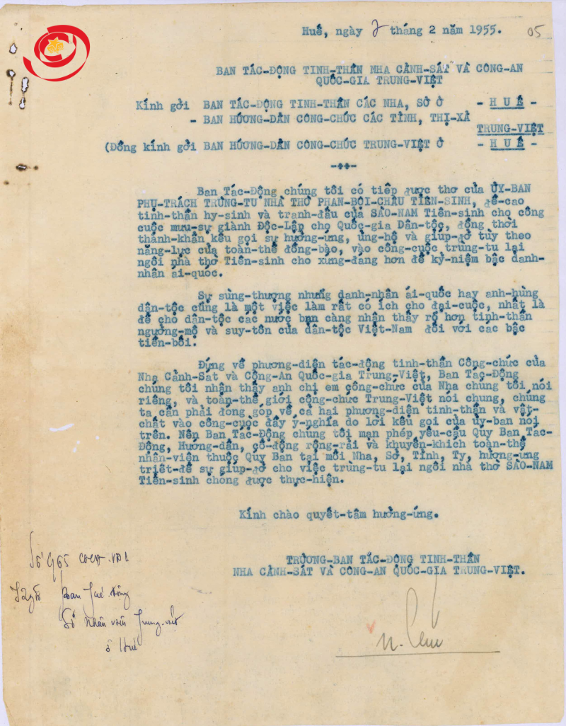 Ban tác động tinh thần Nha Cảnh sát và Công an Trung Việt, gửi thư thông báo, kêu gọi các Ban khác ủng hộ trùng tu nhà thờ Phan Bội Châu tiên sinh. Nguồn: Trung tâm Lưu trữ quốc gia IV