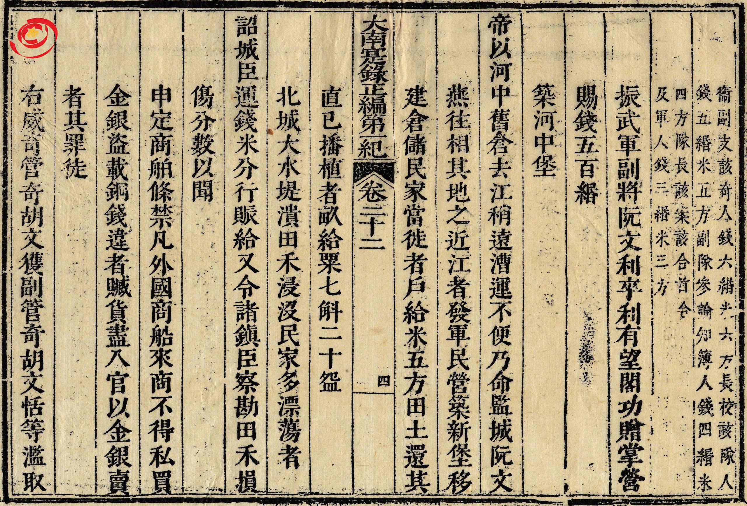 Sự nhất quán trong chính sách này tiếp tục được khẳng định tại quyển 22, mặt khắc 4. Sử liệu mô tả khi đê vỡ, lúa ruộng bị ngập mất và nhà dân bị cuốn trôi nhiều, triều đình ngay lập tức hạ chiếu cho vận chuyển cả tiền và gạo chia đi các hạt để chẩn cấp. Sự hỗ trợ này bao gồm cả lương thực để ăn và ngân sách để dân chúng sửa sang lại nơi ở bị hư hại, giúp ổn định tình hình đời sống tại các vùng bị thiên tai tàn phá nghiêm trọng.