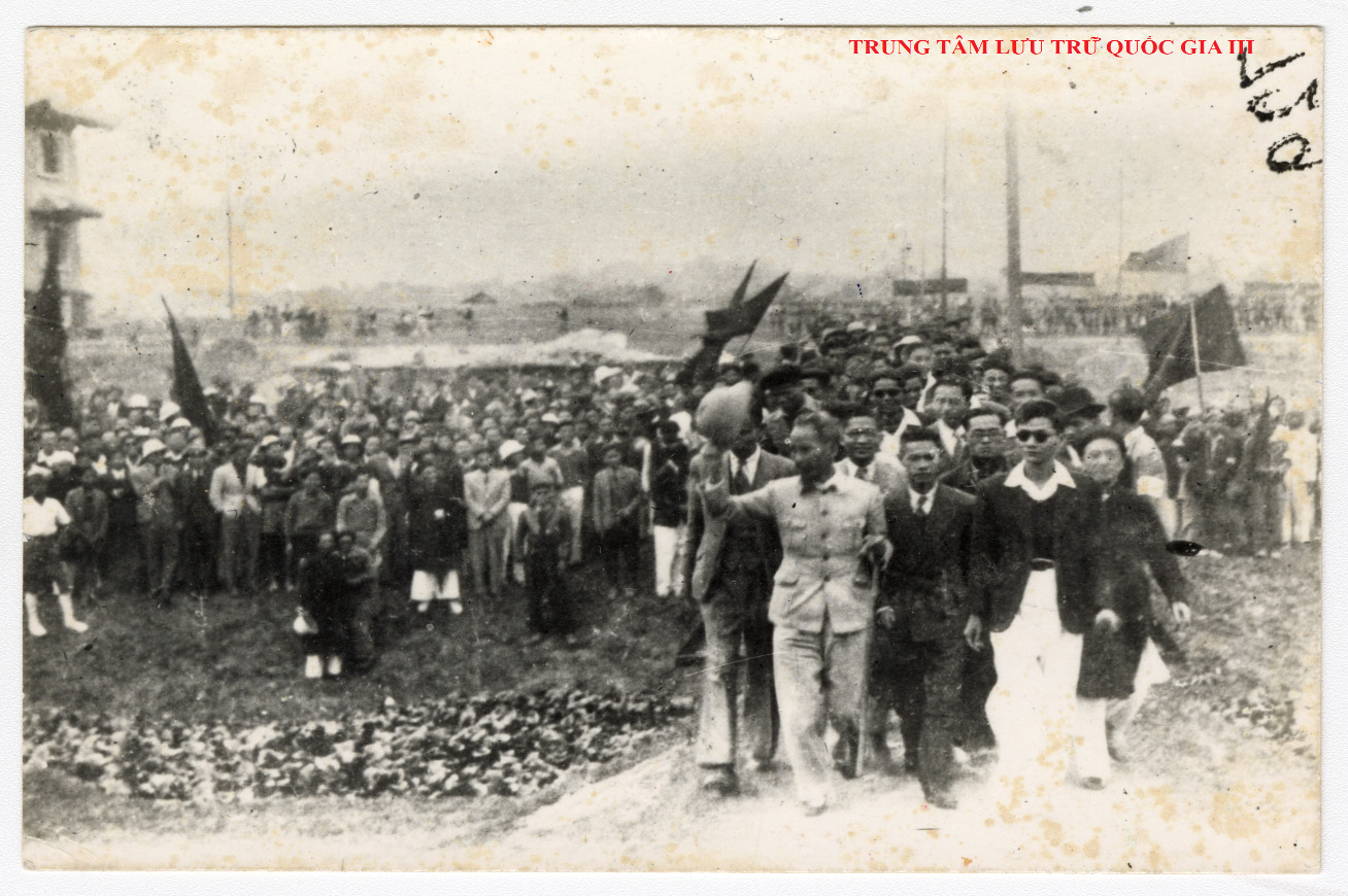 Chủ tịch Hồ Chí Minh trong buổi mít tinh nói về ngày bầu cử ở Việt Nam học xá (nay là Trường Đại học Bách Khoa Hà Nội) có khoảng hơn 10 vạn người tham gia ngày 5/1/1946. Nguồn: Trung tâm Lưu trữ quốc gia III, mục lục ảnh Nguyễn Bá Khoản, SLT199.