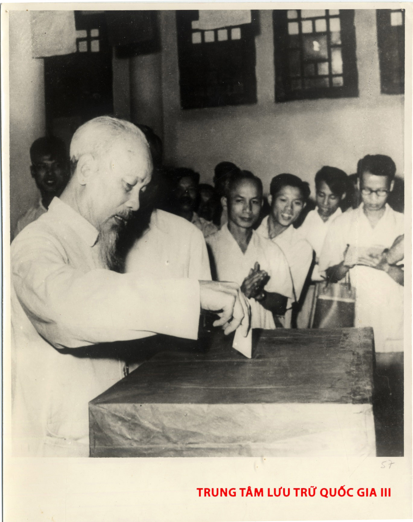 Chủ tịch Hồ Chí Minh thực hiện nghĩa vụ và quyền lợi của một công dân tự do đi bỏ phiếu bầu cử Quốc hội khoá III tại Khu phố Ba Đình, Hà Nội ngày 26/4/1964. Nguồn: Trung tâm Lưu trữ quốc giai III, mục lục ảnh LIV giai đoạn 1954-1985, SLT1491.