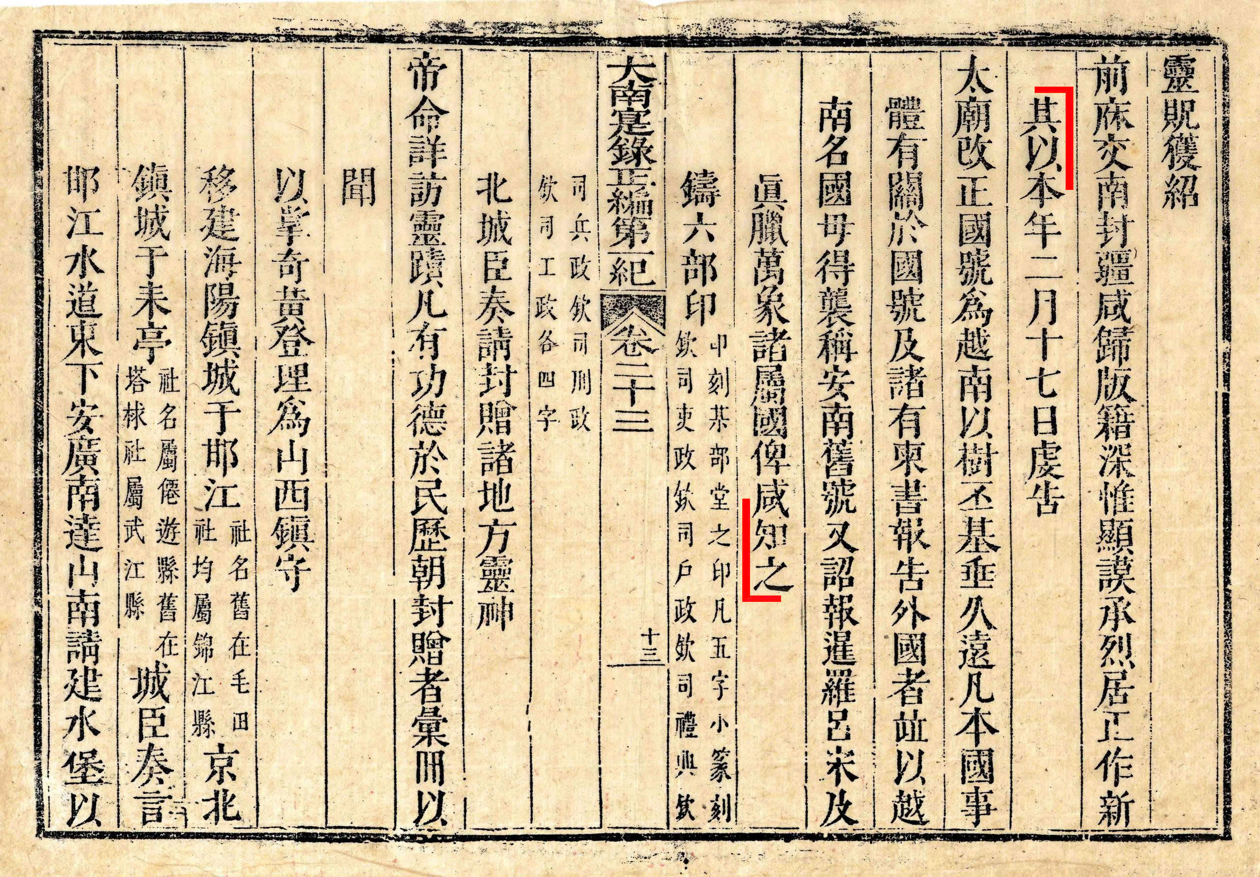 “Lấy ngày 17 tháng 2 năm nay, kính cáo Thái miếu, cải chính quốc hiệu là Việt Nam, để dựng nền lớn, truyền lâu xa. Phàm công việc nước ta việc gì quan hệ đến quốc hiệu và thư từ báo cáo với nước ngoài, đều lấy Việt Nam làm tên nước, không được quen xưng hiệu cũ là An Nam nữa. Lại hạ chiếu báo các nước Xiêm La, Lữ Tống và các thuộc quốc Chân Lạp, Vạn Tượng, khiến đều biết cả”