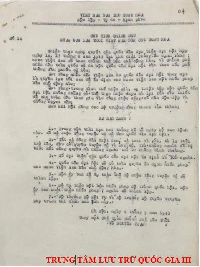 Sắc lệnh v/v mở cuộc Tổng tuyển cử để bầu Quốc dân Đại hội Nguồn: Trung tâm Lưu trữ quốc gia III, phông Phủ Thủ tướng, hồ sơ số 585, tờ số 04.