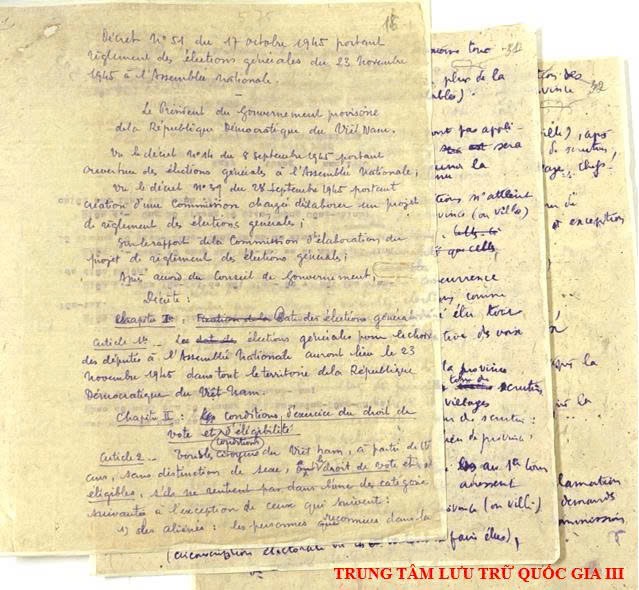Đáng chú ý, Sắc lệnh số 51 còn được viết tay bằng tiếng Pháp. Đây là nguồn tư liệu quý, phản ánh quá trình soạn thảo và hoàn thiện văn bản pháp quy trong giai đoạn đầu xây dựng chính quyền cách mạng. Những dòng chữ viết tay, cùngcác dấu vết chỉnh sửa trên tài liệu, đã góp phần làm sáng tỏ bối cảnh lịch sử và điều kiện hoạt động của bộ máy nhà nước non trẻ, đồng thời cung cấp thêm những bằng chứng sinh động về quá trình chuẩn bị cho cuộc Tổng tuyển cử đầu tiên của nước Việt Nam Dân chủ Cộng hòa.