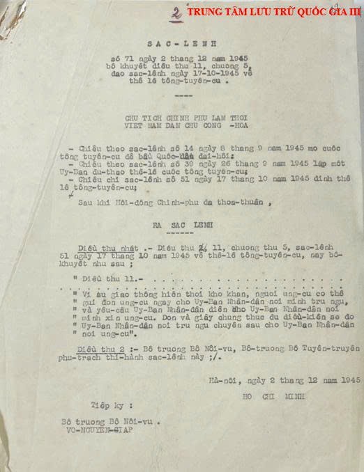Ra đời trong những ngày đầu của Nhà nước Việt Nam Dân chủ Cộng hòa, Sắc lệnh số 51 ngày 17/10/1945 đã ấn định thể lệ cho cuộc Tổng tuyển cử đầu tiên trong lịch sử dân tộc. Văn bản này không chỉ quy định cụ thể nguyên tắc, trình tự và thủ tục bầu cử mà còn thể hiện rõ tư tưởng dân chủ và quyền làm chủ của nhân dân trong việc xây dựng chính quyền mới. Với những quy định tiến bộ về quyền bầu cử và ứng cử của công dân, Sắc lệnh số 51 đã đặt nền tảng pháp lý quan trọng cho cuộc bầu cử Quốc hội ngày 06/01/1946. Qua các tài liệu đang được bảo quản tại Trung tâm lưu trữ quốc gia III, có thể thấy rõ quá trình chuẩn bị nghiêm túc và tầm nhìn chiến lược của Chính phủ lâm thời trong việc thiết lập nền dân chủ ở Việt Nam.