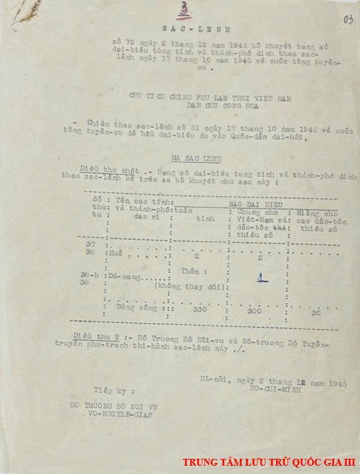 Sắc lệnh số 72 ngày 2/12/1945 bổ khuyết bảng số đại biểu từng tỉnh và thành phố theo Sắc lệnh 51. Nguồn: Trung tâm Lưu trữ quốc gia III, phông Phủ Thủ Tướng, hồ sơ 585, tờ 03.