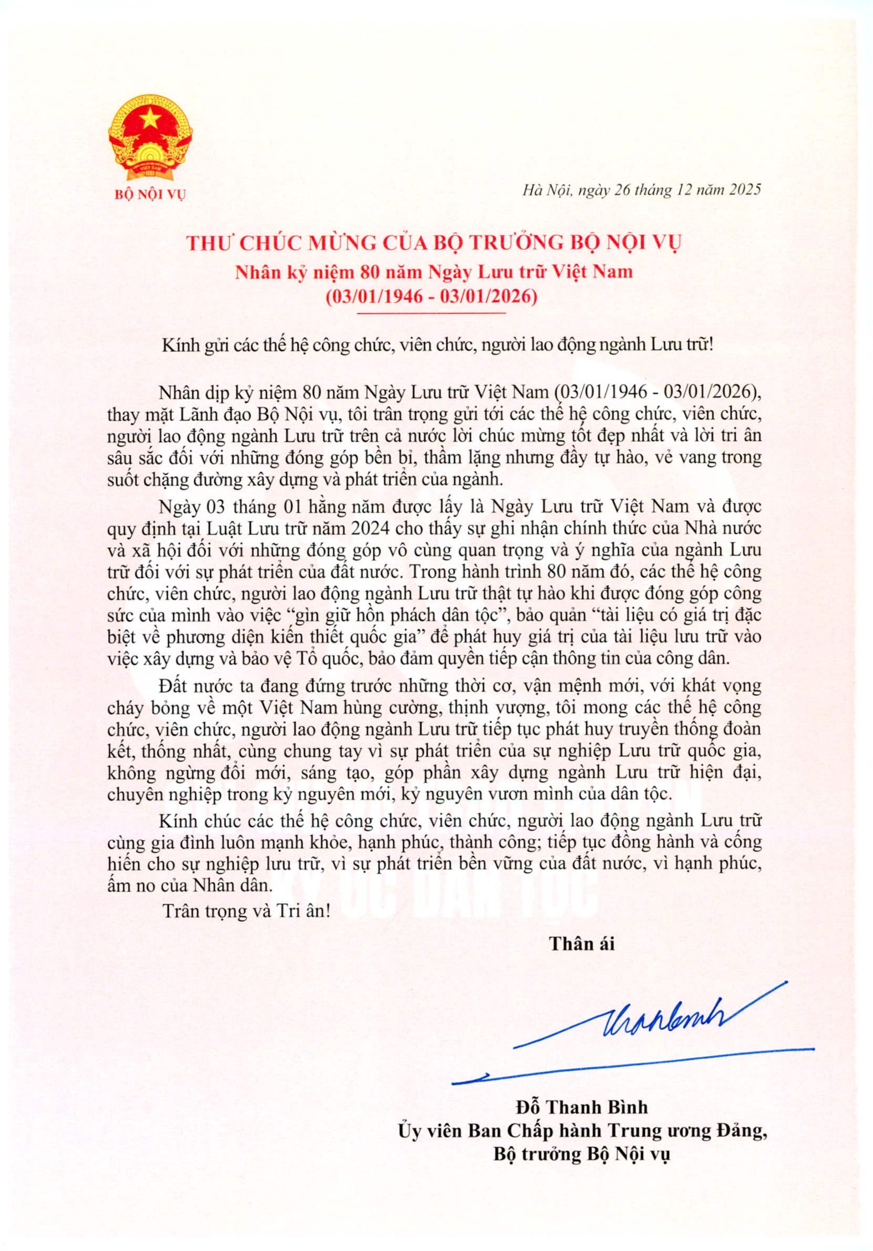 Nhân dịp kỷ niệm 80 năm Ngày Lưu trữ Việt Nam (03/01/1946 – 03/01/2026), Bộ trưởng Bộ Nội vụ Đỗ Thanh Bình gửi tới các thế hệ công chức, viên chức, người lao động ngành Lưu trữ trên cả nước lời chúc mừng tốt đẹp nhất và lời tri ân sâu sắc đối với những đóng góp bền bỉ, thầm lặng nhưng đầy tự hào, vẻ vang trong suốt chặng đường xây dựng và phát triển của ngành. Cổng thông tin điện tử Cục Văn thư và Lưu trữ nhà nước xin trân trọng giới thiệu toàn văn bức thư.